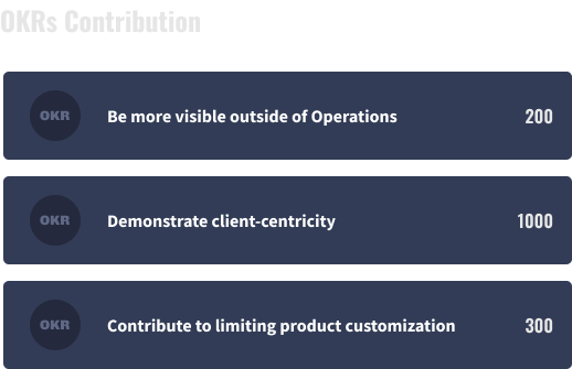 Measure individual engagement, cross-team collaboration, work contributions, assess progression toward objectives.